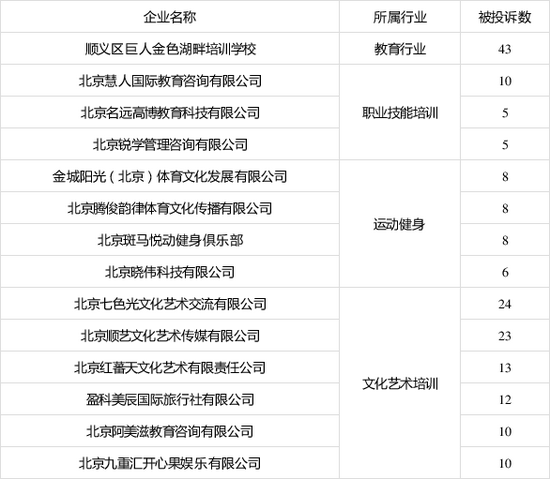 其中,顺义区巨人金色湖畔培训学校在教育行业中投诉最多,北京慧人国际教育咨询有限公司在职业技能培训行业投诉最多,而北京七色光文化艺术交流有限公司则登上了文化艺术培训行业的投诉榜榜首。
